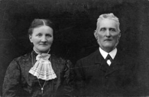 Karoline og Edvard Nielsen fotograferet omkring 1910. Karoline (f. Olsen) var født på gården Skindersø (Skibstrup Overdrev) i 1860. Hun døde i 1938. Edvard var født i 1845 på Sandagergaard og døde i 1936.